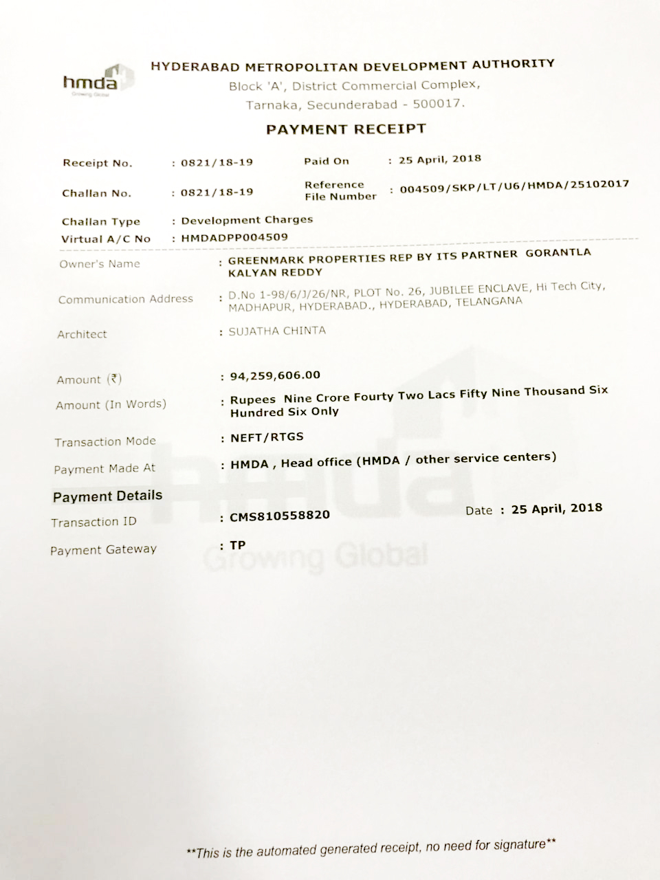 HMDA DC fee Receipt